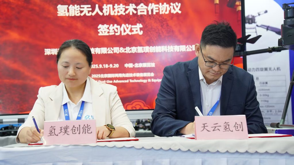 2025年9月18日至9月20日,天云氢创联合北京氢璞创能科技有限公司与北京缔江智航科技有限公司,共同参加2025北京国际两用先进技术装备展览会,并在展会上分别与两家公司签署氢能无人机技术合作协议与千万级氢能无人机采购协议。